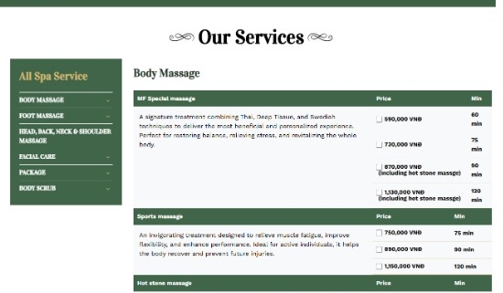 - Range of Services: A good spa should offer a clear and diverse service menu, including body massage, aromatherapy, foot reflexology, and specialized treatments.